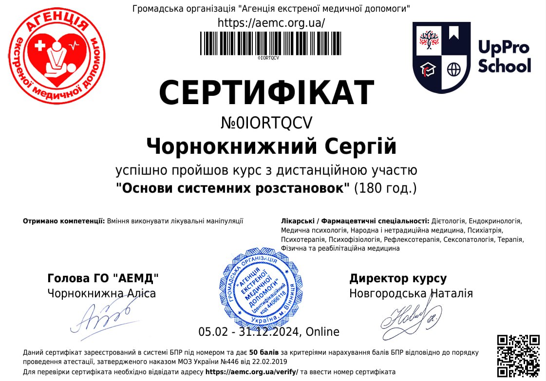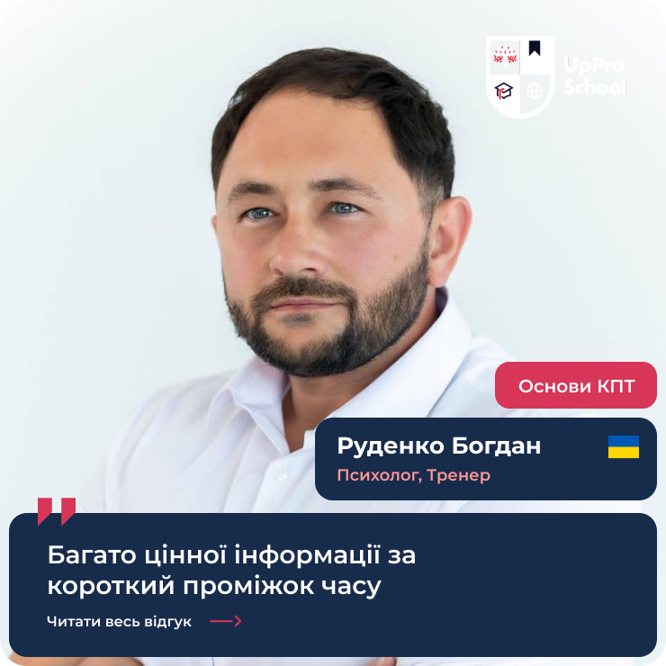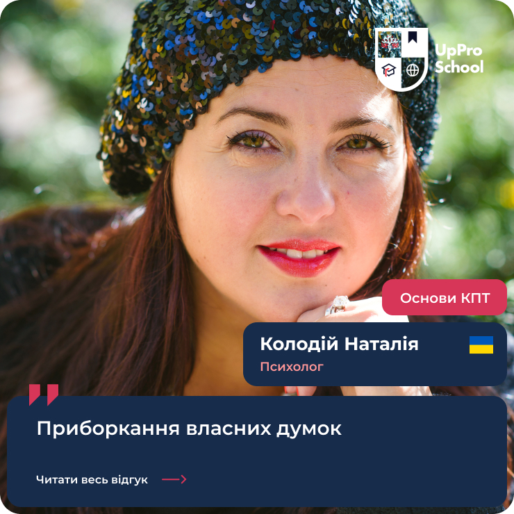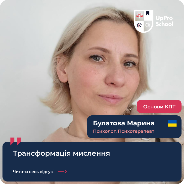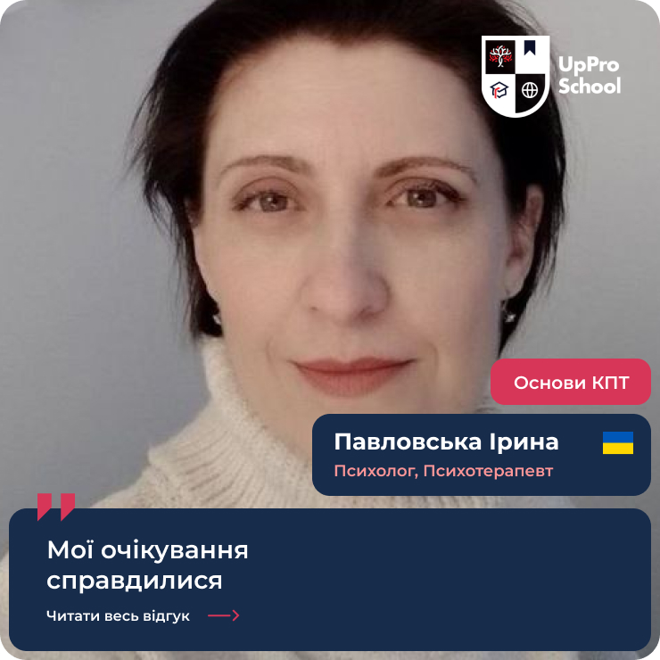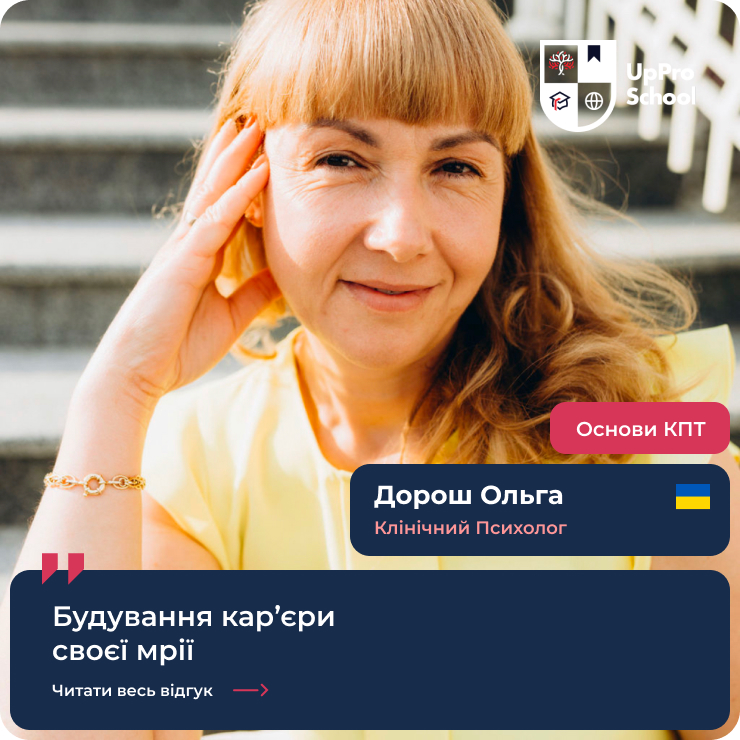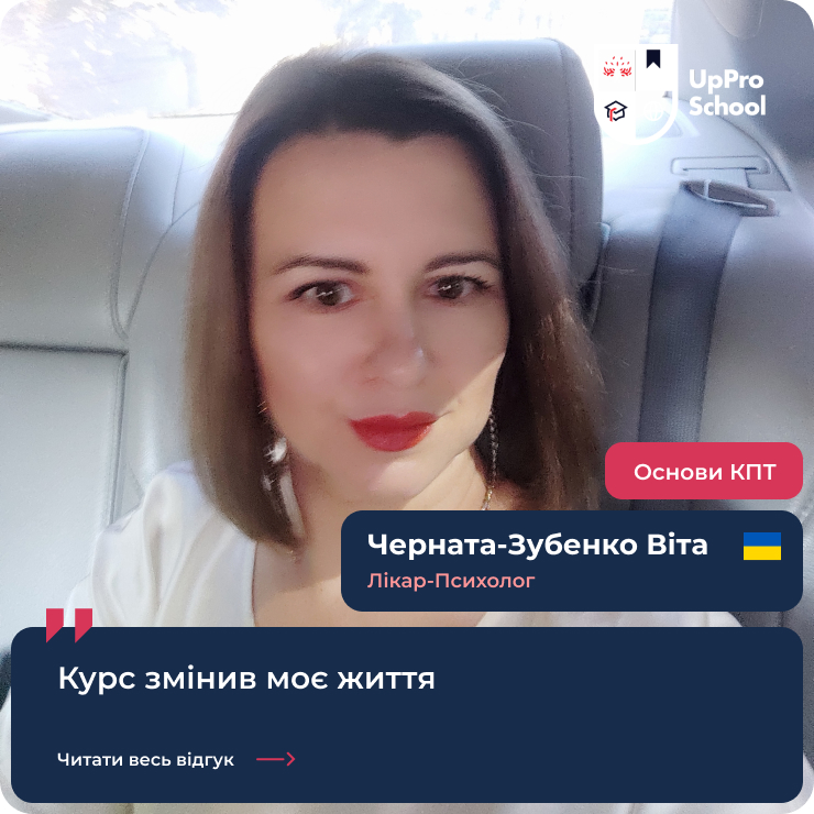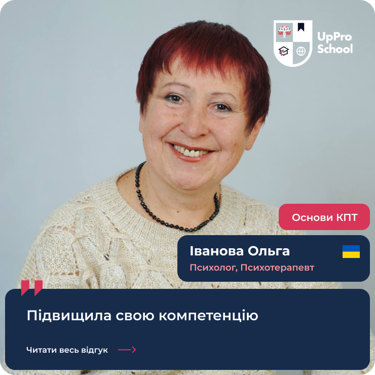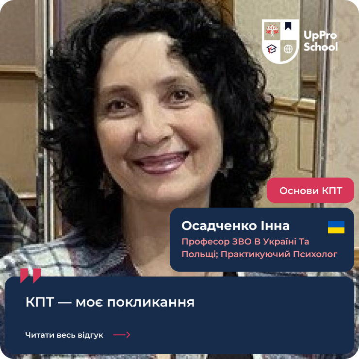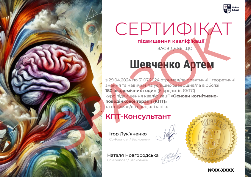 Матимете можливість отримати в Україні сертифікат КПТ-консультанта від міжнародних експертів та UpPro School. Це відкриє вам шлях до професійного консультування з використанням методу КПТ із перспективою подальшого розвитку в практиці.